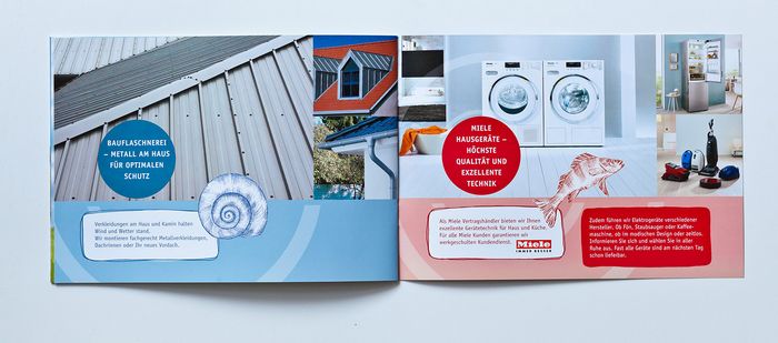 Der 16-seitige Imageprospekt präsentiert das aktuelle Angebot. Jedem Bereich wurde eine passende Farbe zugeordnet und eine Illustration erstellt. In Kombination mit dem Einsatz von stimmungsvollen Händlerfotos und ergänzenden Bildern von Bildagenturen präsentiert sich somit Späth Haustechnik modern, sympathisch, kompetent und mit einer ganz eigenwilligen Note.